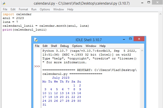 De exemplu, pentru a afișa calendarul pentru anul 2023, putem folosi următorul cod: