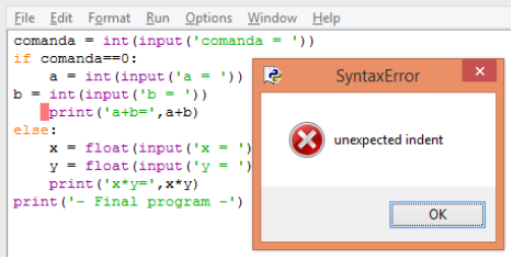 O singură instrucțiune care nu este indentată corect conduce la eroare: